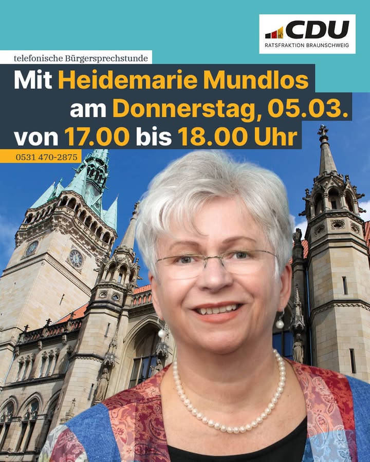 Die CDU-Ratsfraktion lädt zur telefonischen Bürgersprechstunde mit Ratsfrau Heidemarie Mundlos ein.